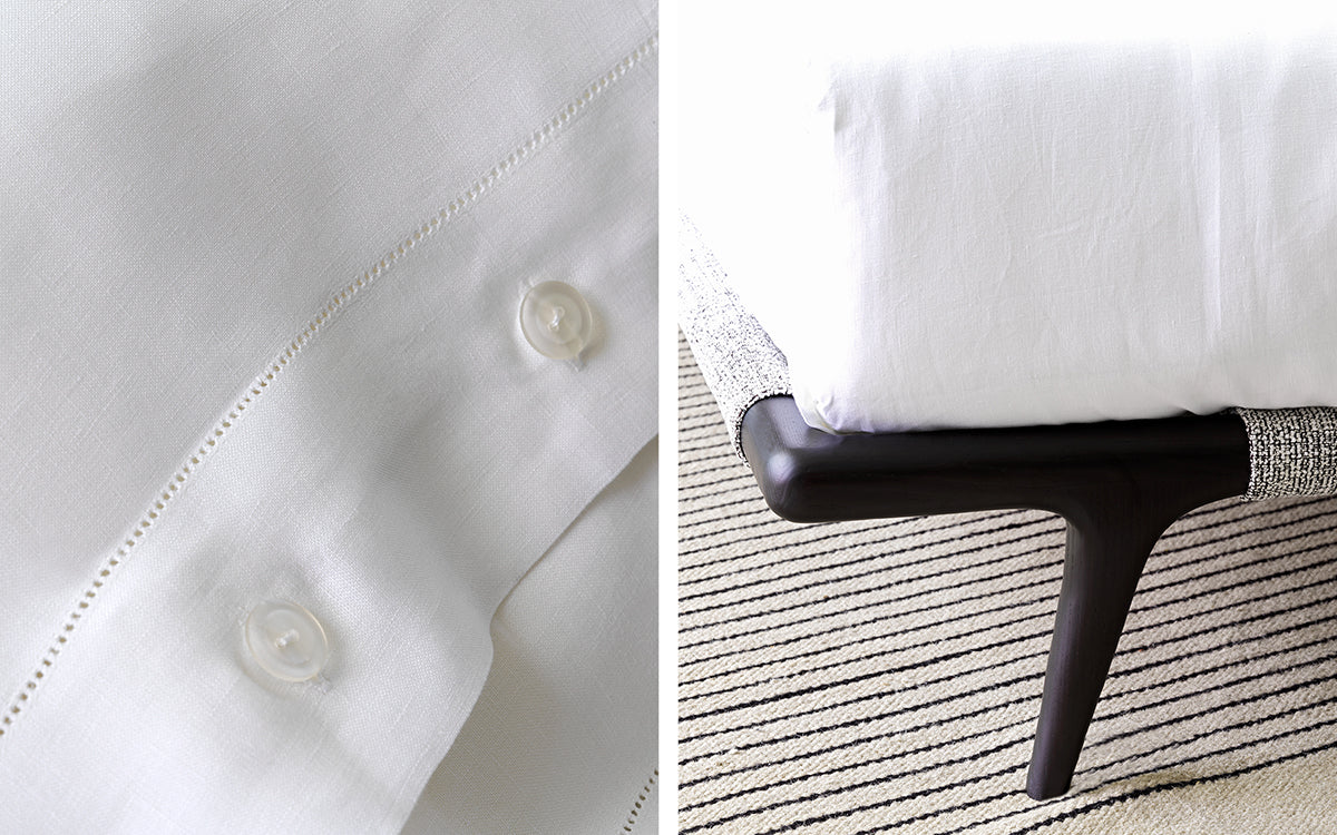 The double-size bed Gaudí is a tribute to wood, a natural element par excellence. The headboard and footboard in solid wood, available in the finishes coffee-brown oak or black-stained oak, are the result of precious artisan processes; they create a sort of sinuous framework ready to receive the upholstery in fabric, leather, or Ecopelle. The cover appears to simply rest on the frame, embracing the wood and following the natural shapes. In reality, it is the fruit of a complex and highly detailed design study, to exalt the beauty of wood and give the bed a welcoming and exclusive appearance.
