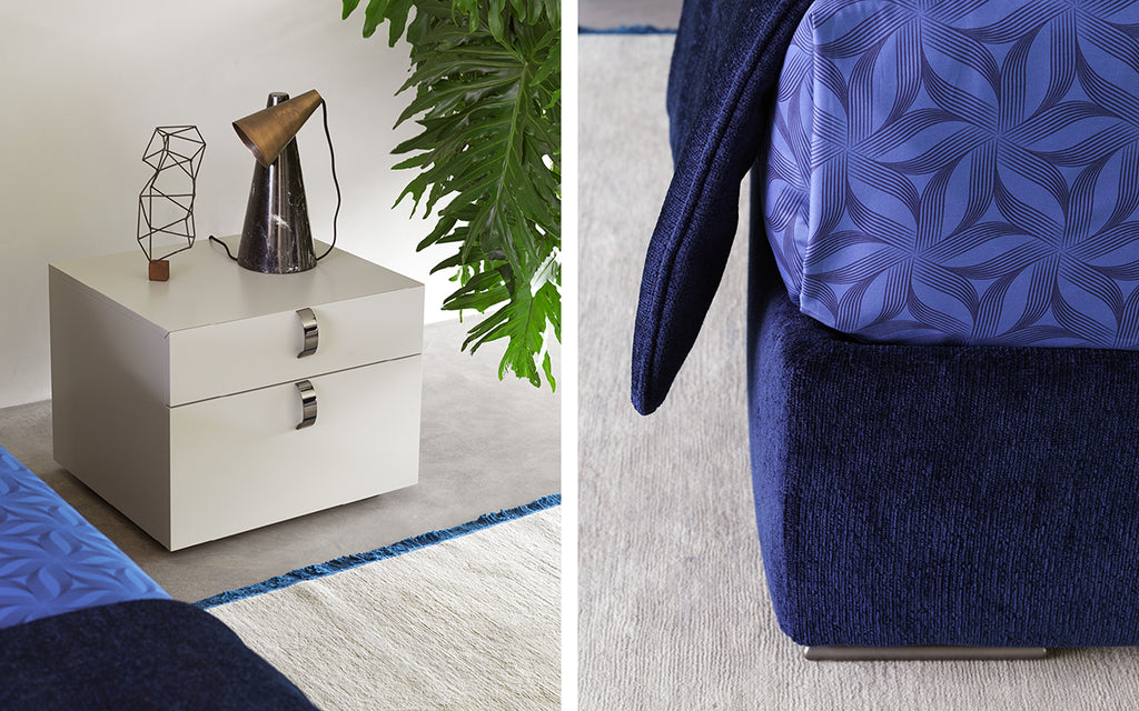 MyPlace is a double-size bed with a modern line, a contemporary reinterpretation of the classical Flou upholstered beds, re-iterating and increasing their strongpoints: an incredibly tangible feeling of comfort and welcome. The base is soft, the headboard is high and thick, deliberately richly padded, like an enormous pillow ready to relieve our tension. The proportions of the bed have been carefully studied and enhanced by high mattresses. MyPlace is available with boxspring base Leonardo, base H25 with fixed slats with rigidity adjustment, storage base, and base with electrical movements Motion 4.