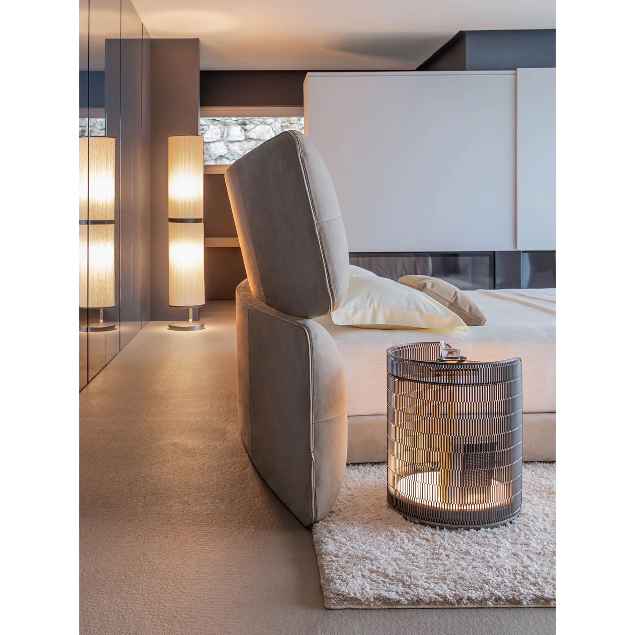 Available in H25 base with adjustable slats and storage base. The base and the front part of the headboard are upholstered in fabric or leather with completely removable covers, while the back cover is not removable and is only available in leather or Greene-coated fabric.