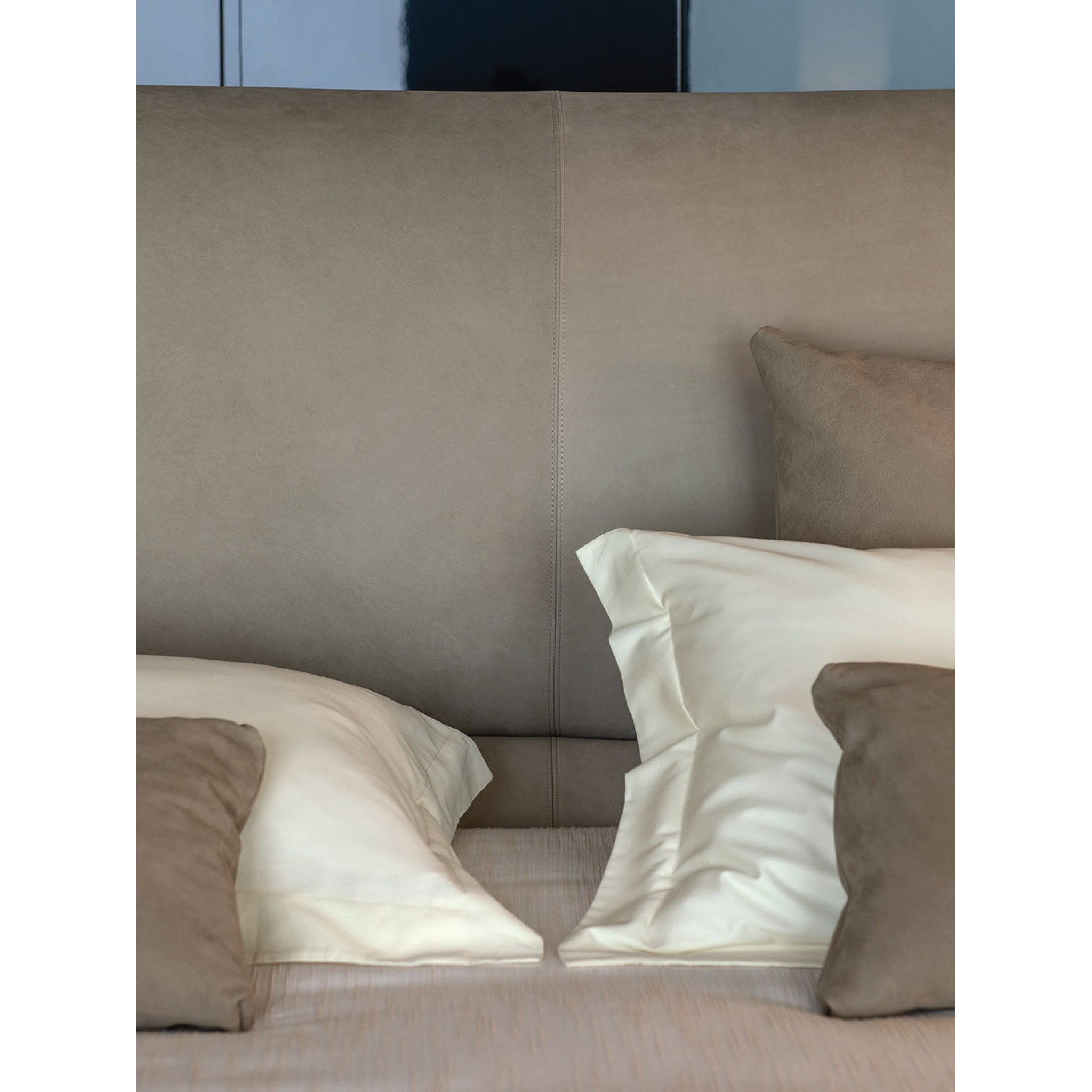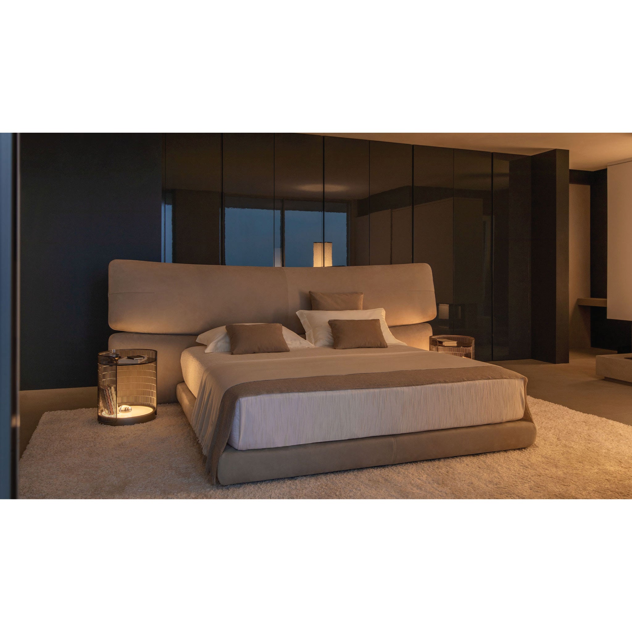 Yuna is part of Flou's range of important and decidedly contemporary textile beds, designed to become the center piece of elegance and refined bedrooms. The generously upholstered headboard is composed of two overlapping horizontal panels that extend to the sides of the sommier with slightly different radii of curvature; a stylistic detail that lightens the overall vision and at the same time accentuates the sensation of welcome and comfort that the design wishes to convey.