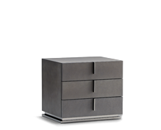 These are the accessory units in the Ari series; the wooden structure of the nighttable with two or three drawers, and a seven-drawer tallboy has been embellished by a matt or gloss lacquered ‘galuchat’ effect finish, available in two colors: deserto and laguna. black chrome handles and base-plate. The two top drawers of the tallboy are fitted with jewerly grids covered with fabric.