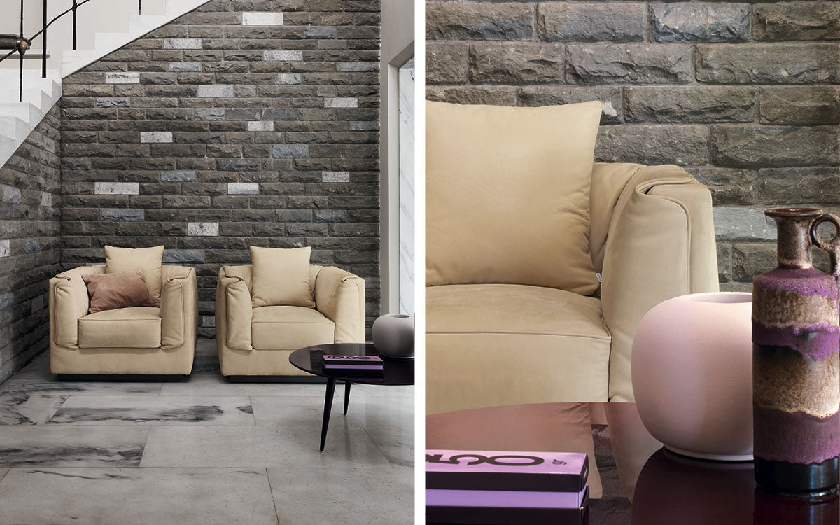 The two- or three-seater sofa and the armchair, are embellished with a second outer padded cover. Further element of elegance is the piping on the seat cushions and along the perimeter of the second outer cover, in a “tone-on-tone” or contrasting color. The sofas and the armchair are available with a cover in fabric, leather or ecopelle. Their elegant style is combined with excellent performance: the structure cover is removable, the outer padded cover is equipped with hooks and can be easily detached. The seat cushions are available in two versions: one more rigid and one more soft. Further comfort through cushions with support padding and decorative cushions.