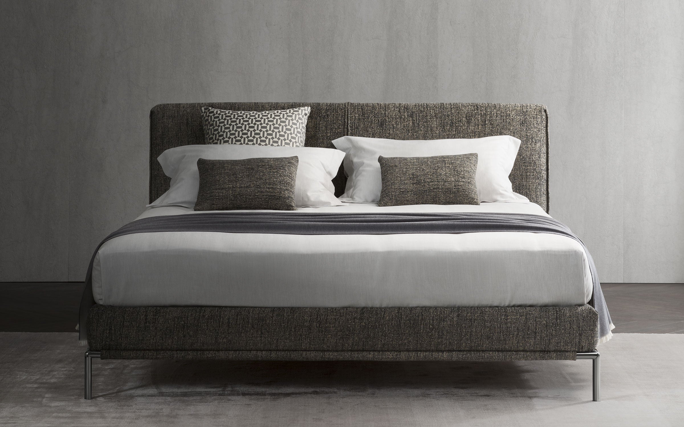 A strong, decisive double-size bed with male traits. It is distant from cold minimalist lines as it has been softened by an important textile component. The softly padded headboard, covered like the base in removable fabric or leather upholstery, forms a delightful contrast with the elegant metal details visible in correspondence with the feet. The mattress support is available as an adjustable slatted version or with electrical movement mechanism. Luxury and comfort are the main features of a bed that has perfect proportions, with a further touch of elegance added by the skilfully tailored stitching on the headboard.